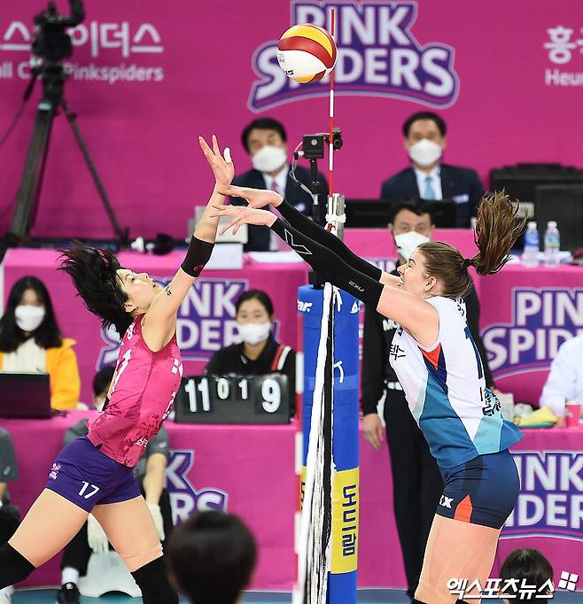 [엑스포츠뉴스 인천, 박지영 기자] 26일 오후 인천 계양체육관에서 열린 '도드람 2020-2021 V리그' 여자부 흥국생명과 GS칼텍스의 경기, 흥국생명 이재영이 공격을 시도할 때 GS칼텍스 러츠가 터치넷 범실을 범하고 있다.