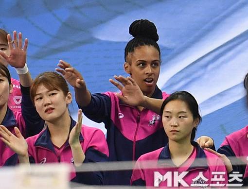 흥국생명 새 외인선수 브루나가 웜업존에서 몸을 풀던 중 동료들과 함께 율동을 하며 응원하고 있다.