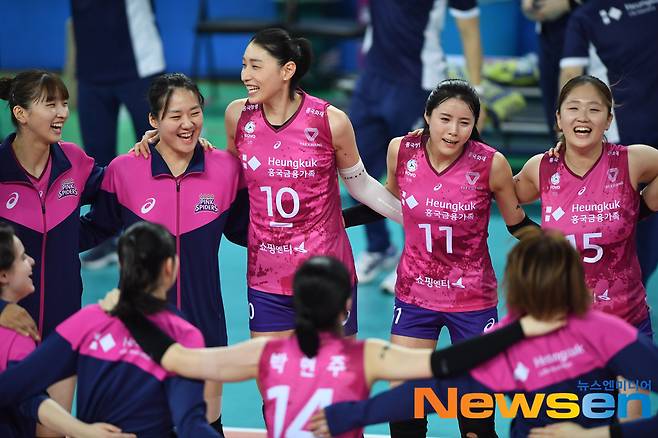 승리한 흥국생명 선수들이 좋아하고 있다.