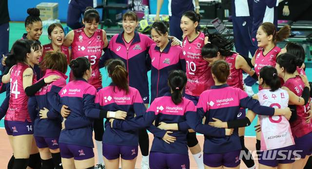 [인천=뉴시스]이윤청 기자 = 26일 인천 계양구 계양체육관에서 열린 프로배구 V리그 여자부 흥국생명과 GS칼텍스의 경기, 세트스코어 3대1로 이긴 흥국생명 선수들이 기뻐하고 있다. 2021.01.26. radiohead@newsis.com