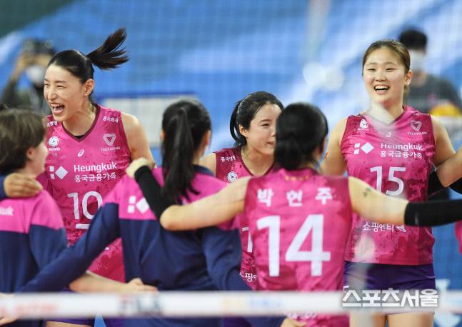 김연경 등 흥국생명의 선수들이 26일 인천 계양체육관에서 진행된 GS칼텍스와의 경기에서 세트 스코어 3-2로 승리한 뒤 기뻐하고있다. 2021.01.26. 김도훈기자 dica@sportsseoul.com