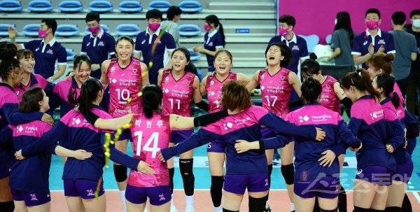 흥국생명이 GS칼텍스에 세트 스코어 3-1로 승리한 뒤 선수들이 코트에서 기쁨을 나누고 있다.