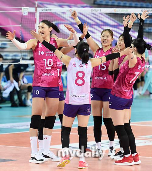 [마이데일리 = 인천 유진형 기자] 흥국생명이 26일 오후 인천계양체육관에서 진행된 '2020-2021 V리그' 여자부, 흥국생명과 GS칼텍스의 경기에서 3-1(23-25, 25-22, 25-21, 25-20)로 승리한 뒤 기뻐하고 있다.