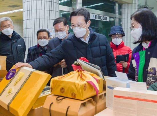 채현일 영등포구청장이 26일 오후 영등포시장역에 마련된 '설맞이 전통시장 공동구매 팝업스토어'에 방문해 제수용품을 구매했다.
