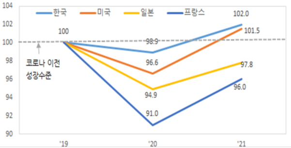 한국은 작년과 올해 성장률을 더한 합산성장률 부문에서도 다른 국가에 비해 높은 수준으로 전망됐다. 합산성장률은 한국의 실물경제가 코로나19 이전 수준으로 회복되는 정도를 의미한다. 한국의 합산성장률은 2.0%로 미국(1.5%), 독일(-2.1%), 일본(-2.2%), 프랑스(-4.0%), 스페인(-5.9%), 이탈리아(-6.5%)보다 높았다.
