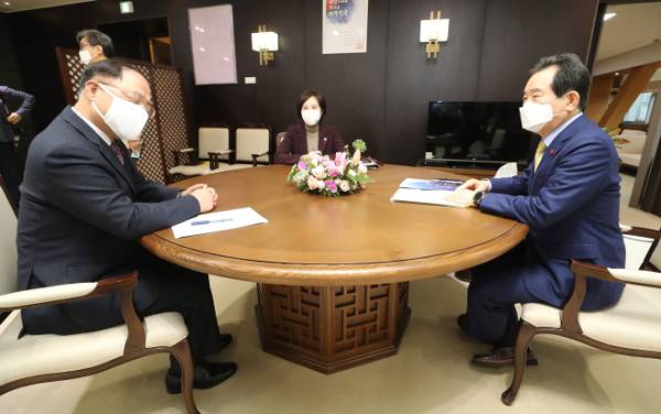 정세균(오른쪽) 국무총리가 26일 정부세종청사에서 홍남기(왼쪽) 부총리 겸 기획재정부 장관, 유은혜 부총리 겸 교육부 장관과 총리-부총리 협의회를 하고 있다. 정 총리는 이 자리에서 “문재인 대통령도 어제 지시한 만큼 홍 부총리가 중심이 돼 ‘손실보상’ 기준 등 제도화 방안을 서둘러 마련해 달라”고 당부했다. 연합뉴스
