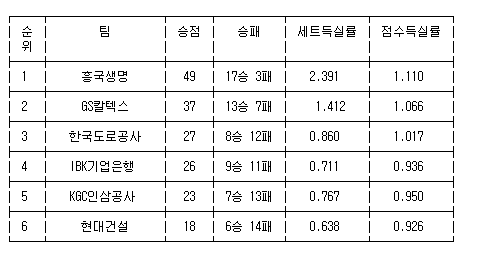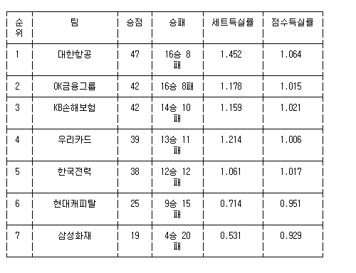 ※순위는 승점-승리 경기 수-세트득실률(총 승리세트/총 패배세트)-점수득실률(총 득점/총 실점) 순.