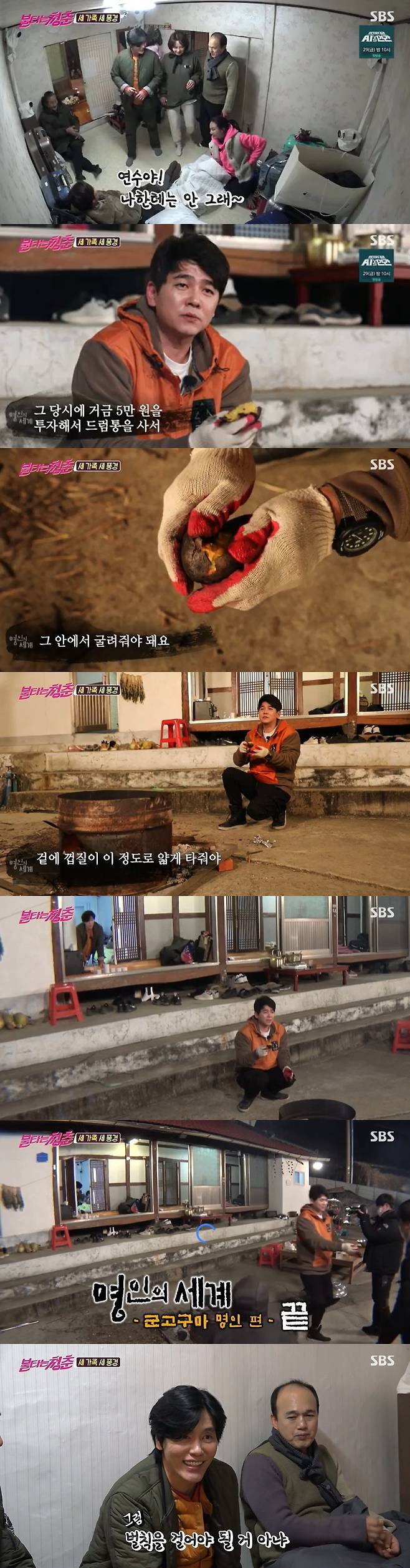 그 사이, 최민용은 혼자 마당에서 군고구마를 구우며 제작진과 ‘명인의 세계’ 군고구마 편을 찍어 웃음을 안겼다. 그는 “중학교 때 친구들과 겨울 아르바이트 삼아서 당시 거금 5만 원을 투자해서 드럼통을 샀다. 전철역 앞에서 군고구마를 팔았다"고 추억을 소환해 눈길을 끌었다.