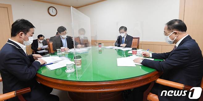 (서울=뉴스1) = 홍남기 부총리 겸 기획재정부 장관이 26일 서울 종로구 정부서울청사에서 열린 관계장관회의(녹실회의)에서 주택공급 확대 방안을 논의하고 있다. (기획재정부 제공) 2021.1.26/뉴스1