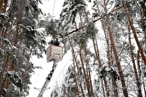 epa08966567 Employees of the power company 'PGE Dystrybucja' during the removal of failures on a high-voltage line near Zolynia in the Podkarpackie province, Poland, 26 January 2021. About 16,000 households in Podkarpacie have been without electricity. The reason is heavy and wet snow that broke the power lines. EPA/DAREK DELMANOWICZ POLAND OUT