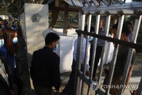 epa08966582 Nay Win San (C), editor and member of the Development Media Group (DMG), arrives to the Sittwe police station for an interrogation, in Sittwe, Rakhine State, Western Myanmar, 26 January 2021. According to local reports, the Myanmar military has sued a reporter and an editor for the DMG media group, editor U Ne Win San and reporter Ma Hnin Nwe, in Rakhine State, under Article 66(d) of the Telecommunications Law. The pair were charged on 22 January, over a recent news report about an alleged looting by government troops of rice from a Kyauktaw Township village. A number of media organizations in Myamar released a statement on 25 January asking the military to submit a complaint with the Myanmar Press Council (MPC) before seeking remedy through the court system, media added. EPA/NYUNT WIN