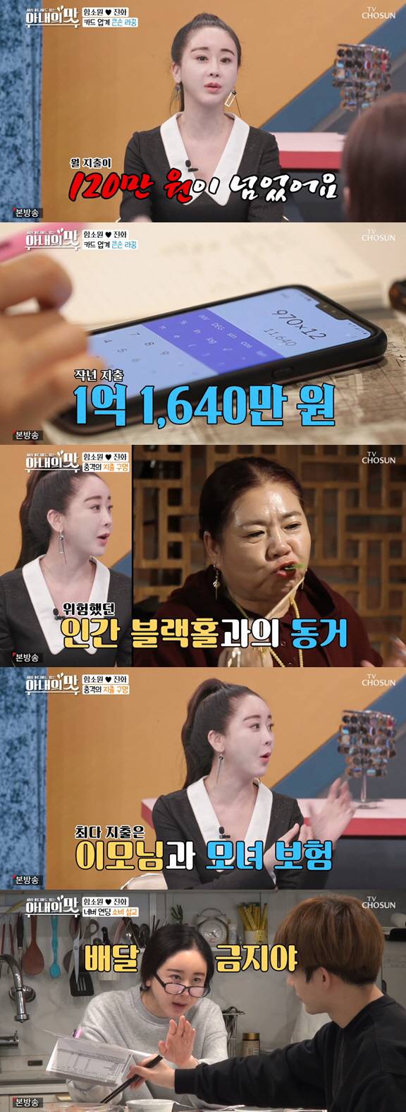 이날 함소원은 카드값을 계산하면서 지출 내역을 살펴봤다. 그런데 작년 지출액이 무려 1억원 이상이었다. 이에 대해 함소원은 "작년에 시어머님과 9개월간 살았는데 식대가 굉장히 많이 나갔다. 그건 아낄수가 없는 돈이었다"면서 "또한 시터 이모님 월급과 보험비가 꽤 나간다"고 말했다.