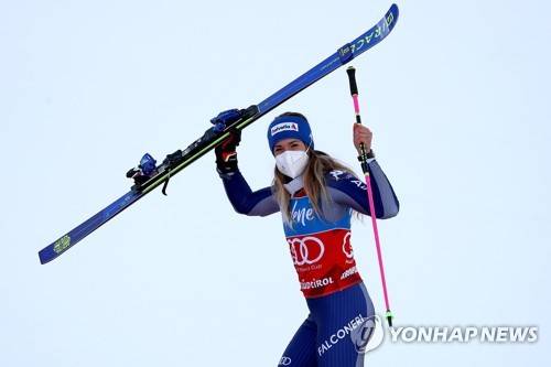 epa08966619 Third placed Marta Bassino of Italy celebrates in the finish area after the Women's Giant Slalom race at the FIS Alpine Skiing World Cup in Kronplatz, Italy, 26 January 2021. EPA/ANDREA SOLERO