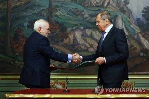 epa08966623 A handout photo made available by the press service of the Russian Foreign Affairs Ministry shows Russian Foreign Minister Sergei Lavrov (R) and Iranian Foreign Minister Mohammad Javad Zarif (L) shake hands during a signing ceremony following their talks in Moscow, Russia, 26 January 2021. Javad Zarif is currently in Moscow on a working visit. EPA/RUSSIAN FOREIGN AFFAIRS MINISTRY HANDOUT MANDATORY CREDIT HANDOUT EDITORIAL USE ONLY/NO SALES