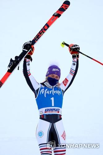 epa08966628 Winner Tessa Worley of France celebrates in the finish area after the Women's Giant Slalom race at the FIS Alpine Skiing World Cup in Kronplatz, Italy, 26 January 2021. EPA/ANDREA SOLERO