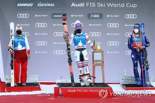 epa08966633 Second placed Lara Gut-Behrami (L) of Switzerland, winner Tessa Worley (C) of France and third placed Marta Bassino (R) of Italy celebrate on the podium after the Women's Giant Slalom race at the FIS Alpine Skiing World Cup in Kronplatz, Italy, 26 January 2021. EPA/ANDREA SOLERO