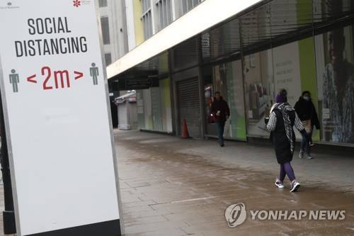 Pedestrians walk past a sign advising them to keep 2 meters apart on Oxford Street in London, Tuesday, Jan. 26, 2021. The U.K. will soon become the fifth country in the world to record 100,000 COVID-19 deaths, after the United States, Brazil, India and Mexico — all of which have much larger populations than Britain's 67 million people. As of Monday, the U.K.'s official coronavirus death toll was 98,531. (AP Photo/Alastair Grant)