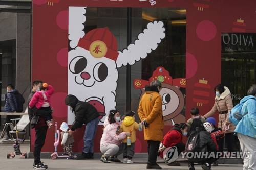 Residents wearing masks to help curb the spread of the coronavirus attend to their children near Chinese Lunar New Year decorations in Wuhan, China, Tuesday, Jan. 26, 2021. The central Chinese city of Wuhan where the coronavirus was first detected has largely returned to normal but is on heightened alert against a resurgence as China battles outbreaks elsewhere in the country. (AP Photo/Ng Han Guan)