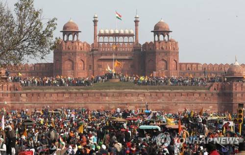epa08966682 Indian Farmers gather at the Red Fort amid their ongoing protest against the new agriculture laws in New Delhi, India, 26 January 2021. Farmers' organizations organized a 'parallel parade' to counter India's Republic Day parade in New Delhi on the same day and fought through police barricades and tear gas to enter Delhi's historic Red Fort complex and also near the police headquater and in parts of centreal Delhi. EPA/RAJAT GUPTA