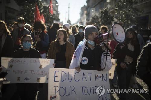 A student chants into a megaphone while holding a sign that reads "education for everyone" during a demonstration in Marseille, southern France, Tuesday Jan. 26, 2021. Teachers and university students marched together in protests or went on strike Tuesday around France to demand more government support amid the pandemic. (AP Photo/Daniel Cole)