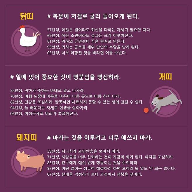돼지띠 # 바라는 것을 이루려고 너무 애쓰지 마라. 59년생, 지나치게 과민반응을 보이지 마라. 71년생, 사람들을 너무 신뢰하는 것이 가끔씩 화가 된다. 여자를 조심하라. 83년생, 친구에게 예의 없게 행동하는 것을 주의하라. 95년생, 어떤 일이든 성급히 해결하려 하면 오히려 될 일도 안 되는 법이다. 07년생, 실패를 걱정하기 보다 과정에서 행복을 찾아라.