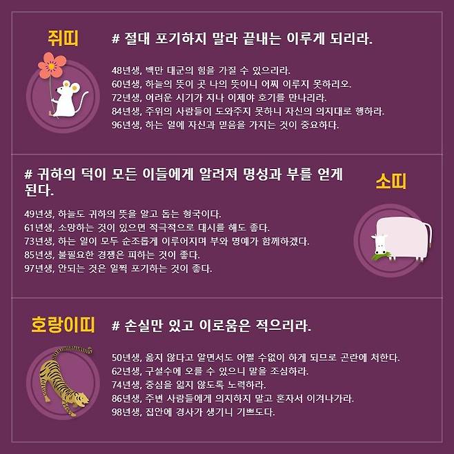 쥐띠 # 절대 포기하지 말라 끝내는 이루게 되리라. 48년생, 백만 대군의 힘을 가질 수 있으리라. 60년생, 하늘의 뜻이 곳 나의 뜻이니 어찌 이루지 못하리오. 72년생, 어려운 시기가 지나 이제야 호기를 만나리라. 84년생, 주위의 사람들이 도와주지 못하니 자신의 의지대로 행하라. 96년생, 하는 일에 자신과 믿음을 가지는 것이 중요하다.