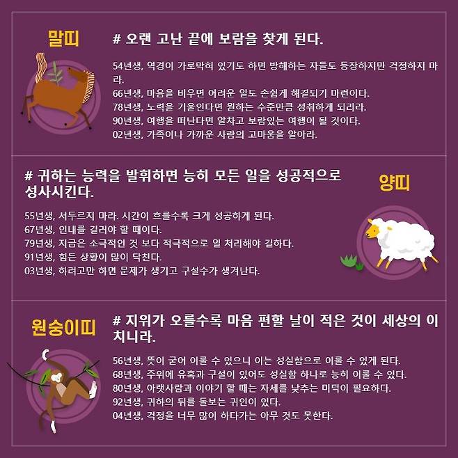 말띠 # 오랜 고난 끝에 보람을 찾게 된다. 54년생, 역경이 가로막혀 있기도 하면 방해하는 자들도 등장하지만 걱정하지 마라. 66년생, 마음을 비우면 어려운 일도 손쉽게 해결되기 마련이다. 78년생, 노력을 기울인다면 원하는 수준만큼 성취하게 되리라. 90년생, 여행을 떠난다면 알차고 보람있는 여행이 될 것이다. 02년생, 가족이나 가까운 사람의 고마움을 알아라.