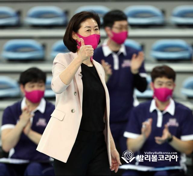 【발리볼코리아닷컴(인천)=김경수 기자】 26일(화) 인천 계양구 계양체육관에서 열린 프로배구 2020-2021 V리그 4라운드 여자부 흥국생명 vs GS칼텍스 인천경기에서 흥국생명 박미희감독이 경기를 지켜보며 선수들을 격려하고 있다. 2021. 1.26.