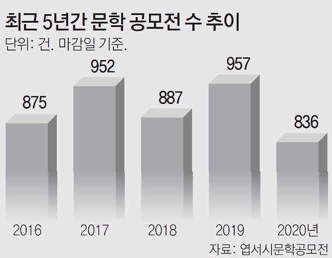 각종 문학 공모전 정보를 제공하는 온라인 사이트 ‘엽서시문학공모전’에 게시된 지난해 공모전 수다. 이곳은 등단을 꿈꾸는 문청(문학청년)들이 공모전을 찾기 위해 즐겨 찾는 사이트다. 최근 5년간 해마다 800건 이상의 공모전이 치러졌는데, 대부분 역사가 짧은 중소 규모다. 사이트 관계자는 “게시된 문학 공모전 중 ‘진짜 작가’를 뽑는 곳은 10∼20%에 불과하다”며 “일부 공모전은 상금을 주기는커녕 당선자에게 책을 내주겠다며 돈을 요구하는 경우도 많다”고 했다.
