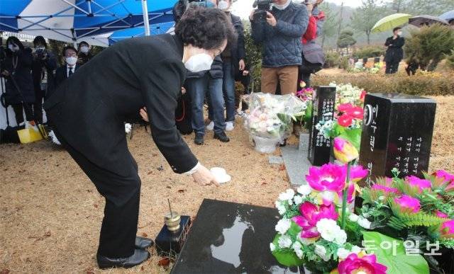 | 이수현 묘소 찾은 어머니 26일 부산 금정구 영락공원에서 고 이수현 씨의 묘에 어머니 신윤찬 씨가 술잔을 올리고 있다. 이날 묘소에서는 이 씨가 2001년 1월 26일 일본 도쿄 신오쿠보역에서 선로에 추락한 일본인 취객을 구하다 숨진 지 20년을 맞아 추도식이 열렸다. 부산=박경모 기자 momo@donga.com |