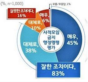 발표에 따르면 경기도가 선제적으로 제안해 전국으로 확대된 '5인이상 사적모임 금지'에 대해 '잘한 조치다'라는 응답이 83%로 나타났다.