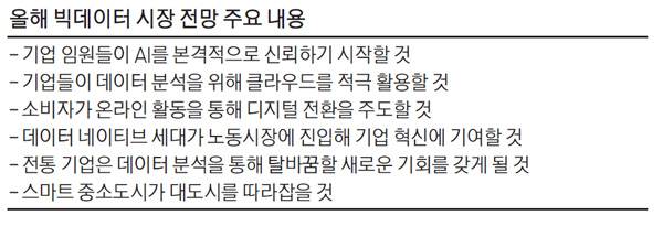미국 빅데이터 분석기업 SAS가 전망한 올해 데이터 시장 주요 트렌드다. 1976년 미국에서 설립된 SAS는 기업이 빅데이터를 활용해 의사 결정을 내리도록 지원하는 AI 기반 소프트웨어를 제공하고 있다. 애플, 월마트, 도요타, 삼성전자 등 미국 경제 전문지 포천(Fortune) 선정 세계 100대 기업 대부분이 이 회사의 소프트웨어를 사용한다. SAS를 통해 빅데이터 시장의 주요 트렌드를 짚어봤다.