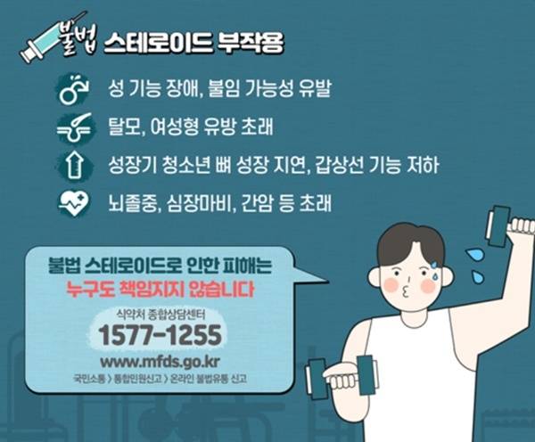 그는 “의약품 불법판매자는 약사법 제44조 또는 제61조 위반으로 벌칙조항 제93조에 따라 5년 이하의 징역 또는 5000만원 이하의 벌금형을 받을 수 있다”며 “구매자는 별도로 처벌되지 않지만 병원이나 약국이 아닌 곳에서 불법적으로 스테로이드를 구매·사용하지 않아야 한다”고 강조했다.