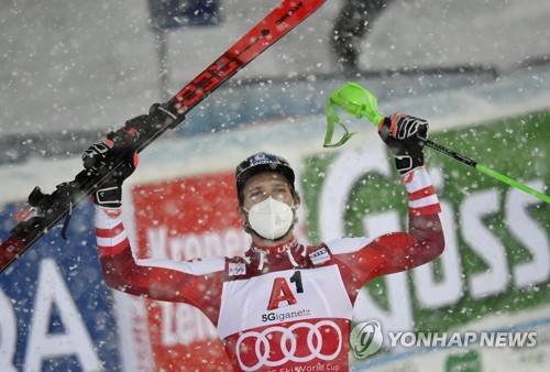 epa08967371 Winner Marco Schwarz of Austria celebrates after the men's Slalom at the FIS Alpine Skiing World Cup event in Schladming, Austria, 26 January 2021. EPA/CHRISTIAN BRUNA
