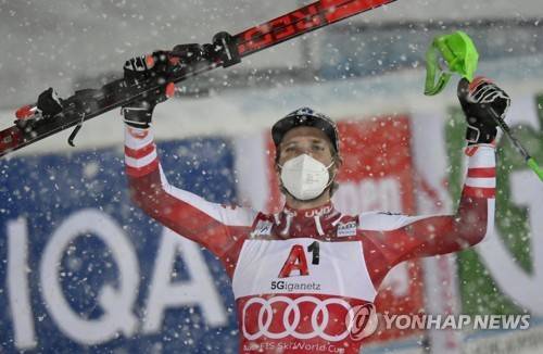 epa08967372 Winner Marco Schwarz of Austria celebrates after the men's Slalom at the FIS Alpine Skiing World Cup event in Schladming, Austria, 26 January 2021. EPA/CHRISTIAN BRUNA