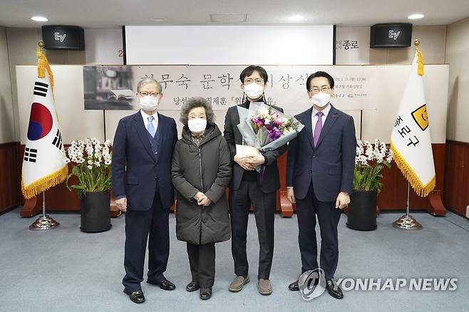 (서울=연합뉴스) 지난 25일 서울 종로구청 기획상황실에서 열린 '제26회 한무숙 문학상 시상식'에서 김영종 종로구청장(오른쪽)이 한무숙문학관 김호기 관장 부부(왼쪽), 소설가 최제훈과 기념 촬영을 하고 있다. 2021.1.27