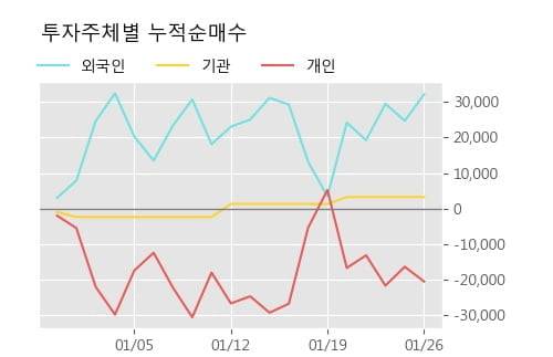 지난 한달을 기준으로 보면 외국인이 3.2만주를 순매수했고, 기관도 3,228주를 순매수했다. 반면 개인들은 2.1만주를 순매도한 것으로 나타났다. 같은 기간 개인의 거래비중이 89.3%로 가장 높아, 주요 거래 주체로 참여했음을 알 수 있다.