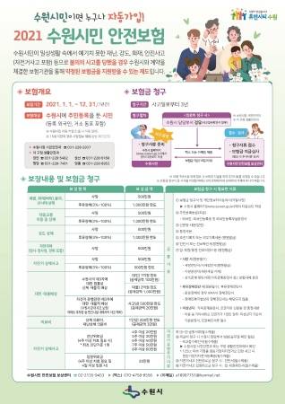 수원시 홈페이지(https://www.suwon.go.kr) 검색창에서 '시민안전보험'을 검색해 보장 항목·한도 등 자세한 내용을 볼 수 있다.