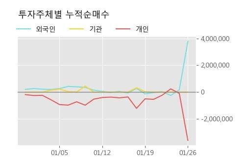 지난 한달을 기준으로 보면 외국인이 378.5만주를 순매수한 반면, 기관은 1,997주를 순매도했고, 개인들도 360.4만주를 순매도한 것으로 집계됐다. 같은 기간 개인의 거래비중이 94.4%로 가장 높아, 주요 거래 주체로 참여했음을 알 수 있다.