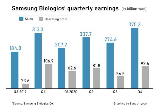 For the full year, Samsung Biologics raised 292.8 billion won in operating profit, jumping more than three-fold from the previous year on sales of 1.16 trillion won that soared 66.02 percent. Net profit also climbed 18.76 percent to 241 billion won during the same period.