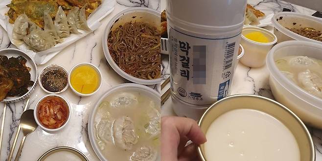 사진 속 식탁 위에는 다양한 음식이 차려져 있다. 뜨끈한 만둣국부터 모둠전, 짜장면이 먹음직스러운 빛깔을 내뿜는다. 심은진은 막걸리도 한잔 하며 소소한 일상의 재미를 즐긴다.