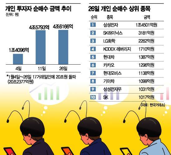 [아시아경제 이선애 기자, 이민우 기자] 4조6000억원. 26일 개인 투자자들이 외국인과 기관이 쏟아낸 4조7760억원의 매도 폭탄을 받아내면서 지수 하락을 방어하기 위해 기록한 순매수 금액이다. 역대 최대다. 이날 개인 투자자들은 유가증권시장에서 4조2050억원, 코스닥시장에서 4113억원 등 양 시장에서 4조6166억원을 순매수하면서 역대 최대 순매수 기록을 바꿨다. 종전 기록은 지난 11일 기록했던 유가증권시장 4조4921억원, 코스닥시장 860억원 등 총 4조5793억원이다. 개인 투자자들의 총 순매수 금액은 20조2377억원으로 20조원을 돌파하는 기록도 세웠다. 지난해에는 53거래일이 걸려 20조원을 돌파했지만 올해는 역대급 유동성에 힘입어 17거래일만에 달성했다.