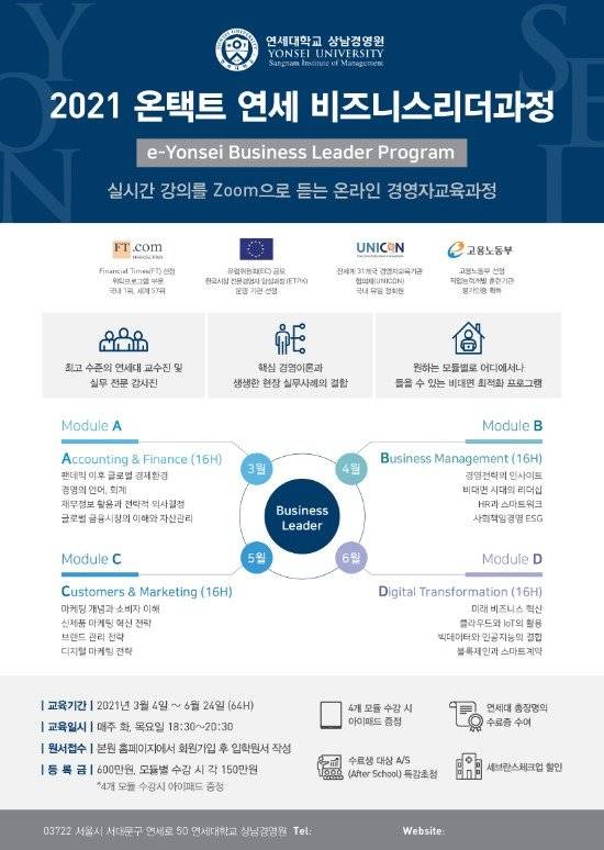 연세대학교 상남경영원(원장 이호근)은 2021년 상반기 비대면·온라인 모집과정으로 ‘온택트 연세 비즈니스리더과정’을 운영한다.