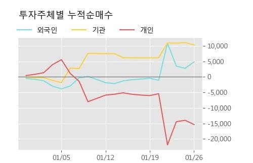 지난 한달을 기준으로 보면 외국인이 4,877주를 순매수했고, 기관도 1.0만주를 순매수했다. 반면 개인들은 1.5만주를 순매도한 것으로 나타났다. 같은 기간 개인의 거래비중이 88.5%로 가장 높아, 주요 거래 주체로 참여했음을 알 수 있다.