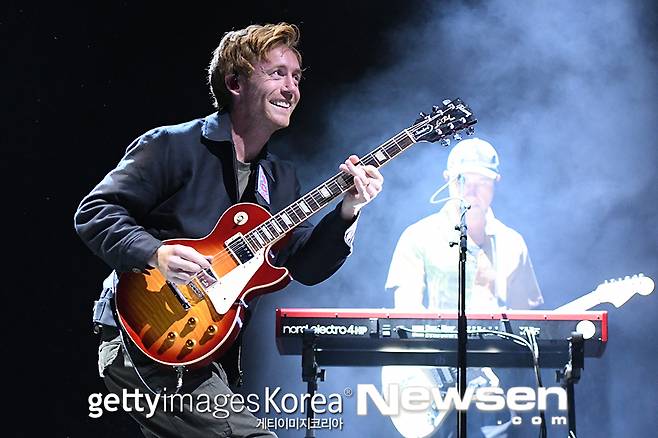 SIX60의 지 프레이저가 1월 23일(현지시간) 뉴질랜드 헤이스팅스의 호크스 베이 A&P 쇼그라운드에서 열린 콘서트에서 22,000명의 팬들이 참석한 가운데 공연하고 있다.
