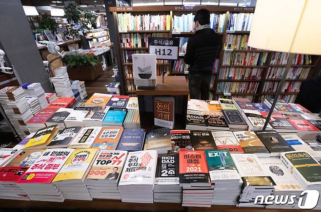 (서울=뉴스1) 이재명 기자 = 2030세대의 주식 열풍이 높아지고 있는 27일 오전 서울 시내의 한 대형서점에서 시민들이 주식 관련 서적을 살펴보고 있다. 2021.1.27/뉴스1