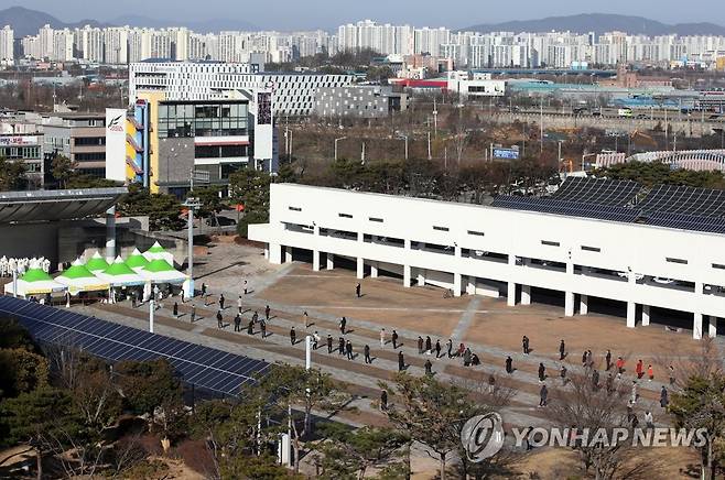 (광주=연합뉴스) 조남수 기자 = IM선교회에서 운영 중인 국제학교에서 무더기로 확진자가 나오며 코로나19 감염 규모가 다시 증가세에 있는 27일 오전 광주시청 광장에 마련된 신종 코로나바이러스 감염증(코로나19) 선별검사소에 시민들이 긴 줄을 서 대기하고 있다. 2021.1.27