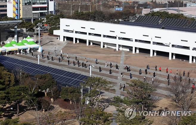 (광주=연합뉴스) 조남수 기자 = IM선교회에서 운영 중인 국제학교에서 무더기로 확진자가 나오며 코로나19 감염 규모가 다시 증가세에 있는 27일 오전 광주시청 광장에 마련된 신종 코로나바이러스 감염증(코로나19) 선별검사소에 시민들이 긴 줄을 서 대기하고 있다. 2021.1.27