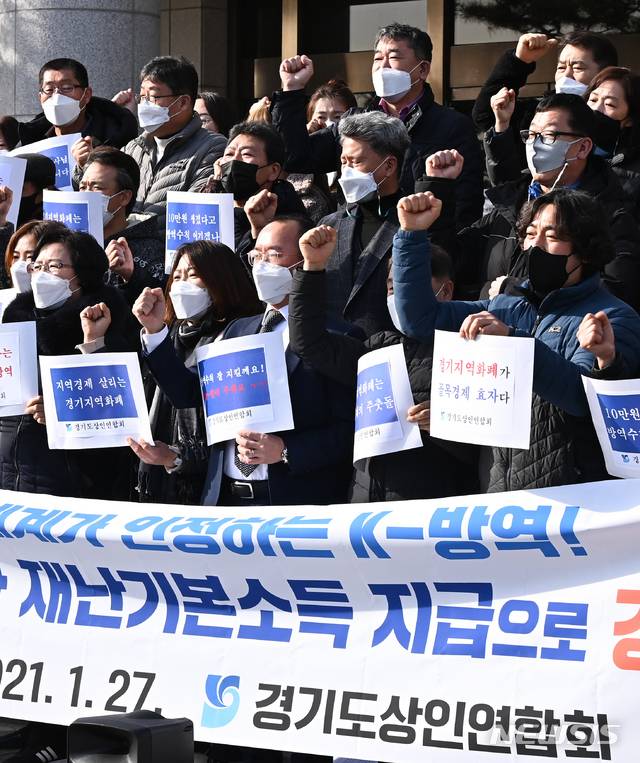 [수원=뉴시스] 김종택기자 = 경기도 상인연합회 회원들이 27일 오전 경기도 수원시 팔달구 경기도의회 앞에서 설 전에 경기도 2차 재난 지원금 지급을 호소하는 긴급 기자회견을 하고 있다 . 2021.01.27.