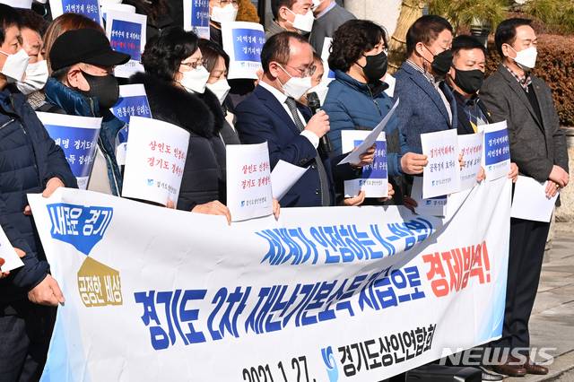 [수원=뉴시스] 김종택기자 = 경기도 상인연합회 회원들이 27일 오전 경기도 수원시 팔달구 경기도의회 앞에서 설 전에 경기도 2차 재난 지원금 지급을 호소하는 긴급 기자회견을 하고 있다 . 2021.01.27.